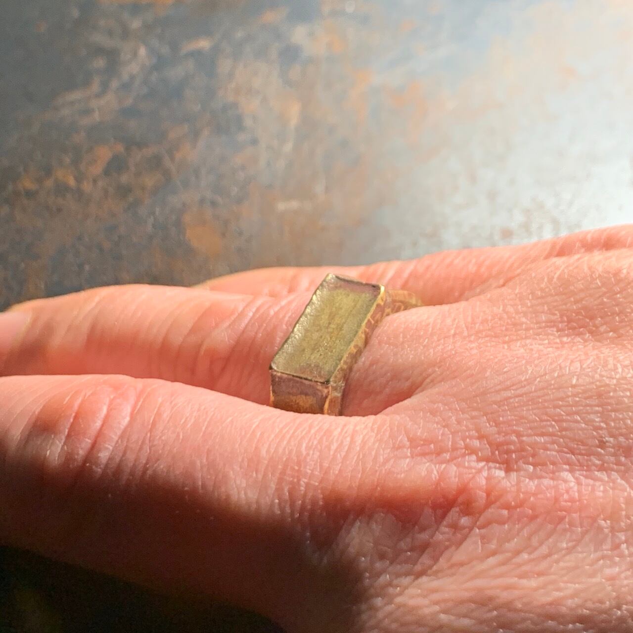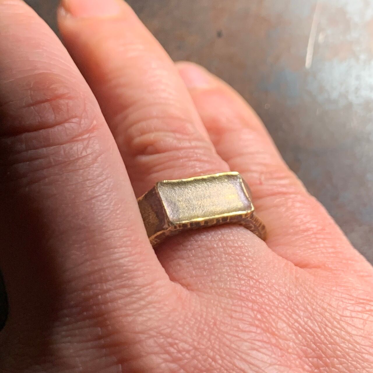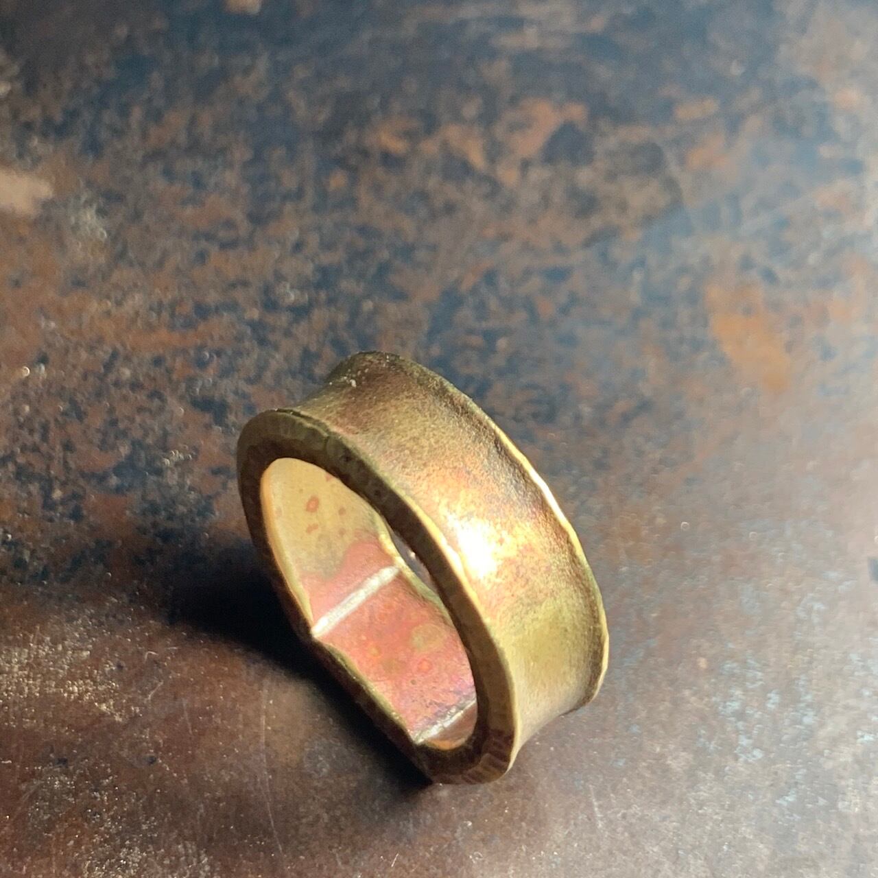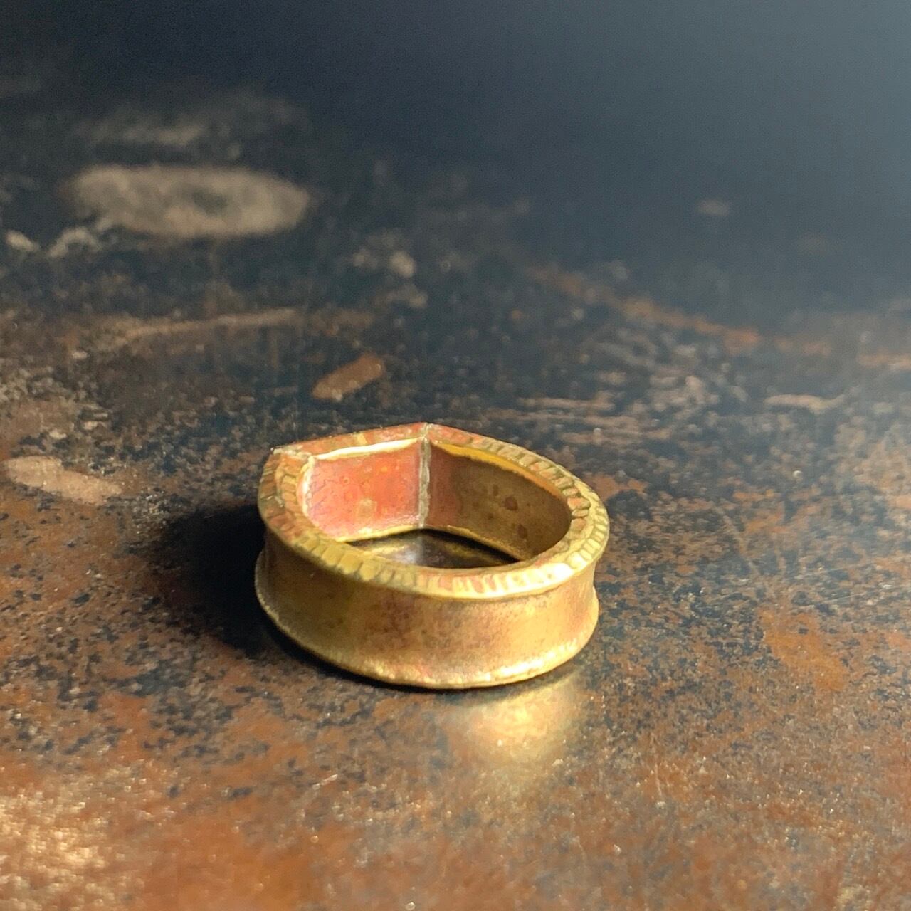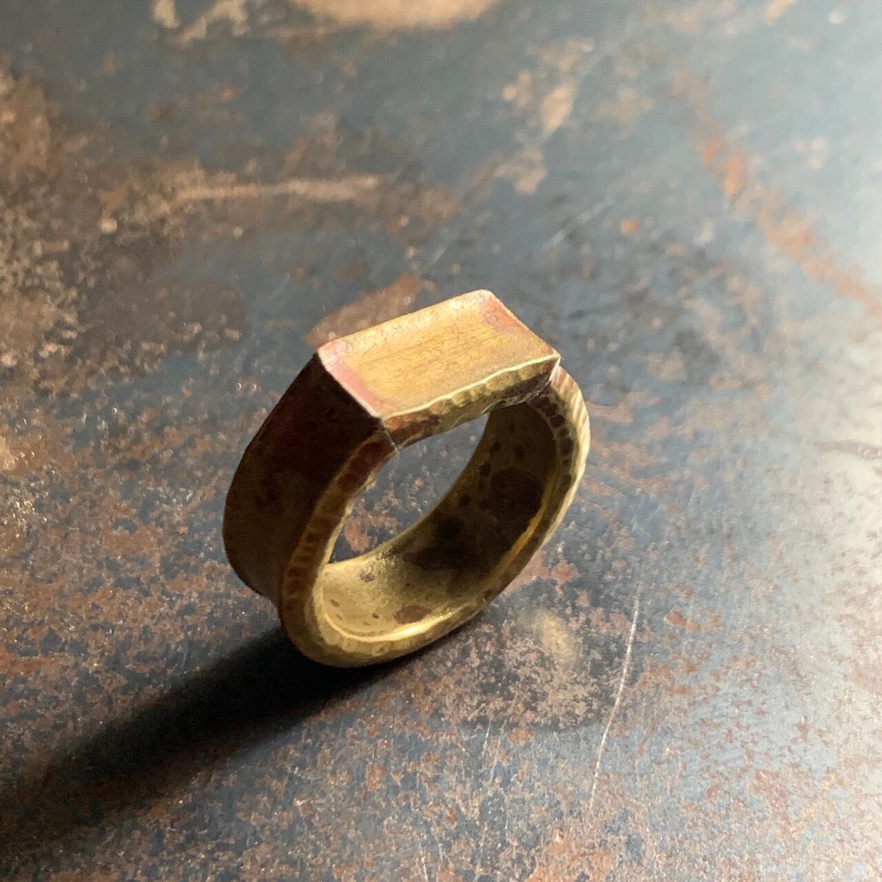brass ring 18号 kisōを象徴する真鍮プレートがトップのシグネチャーリング。 まだらな模様は加工中に自然と発生した色。