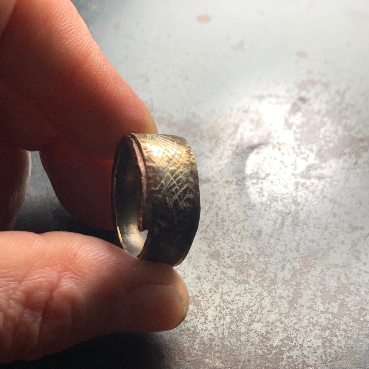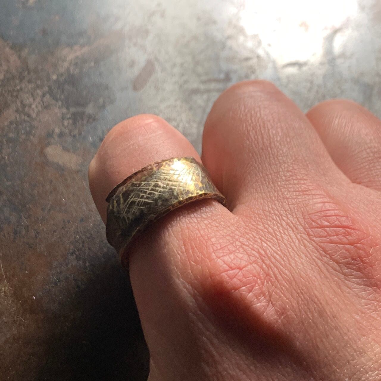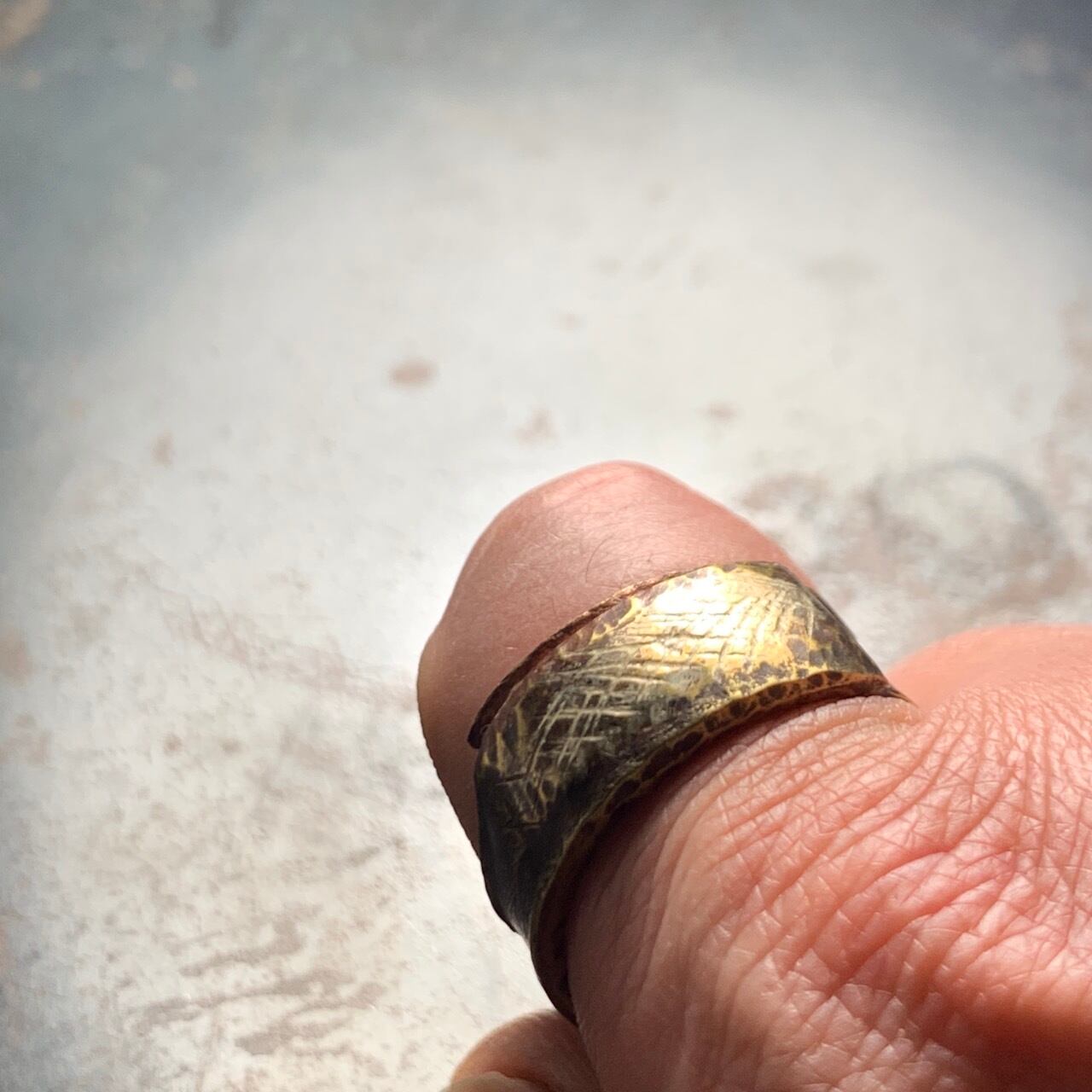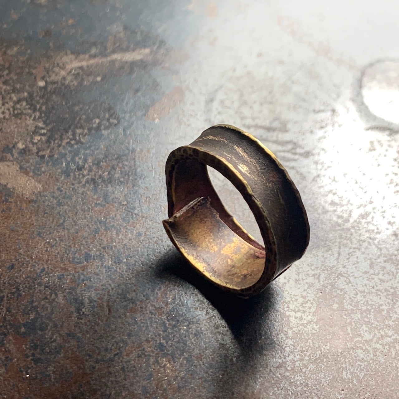 brass ring 24号 指に巻き付いたような形のリング 正面には引っ掻いたような傷模様が施されていおり、その傷目に銀を流している
